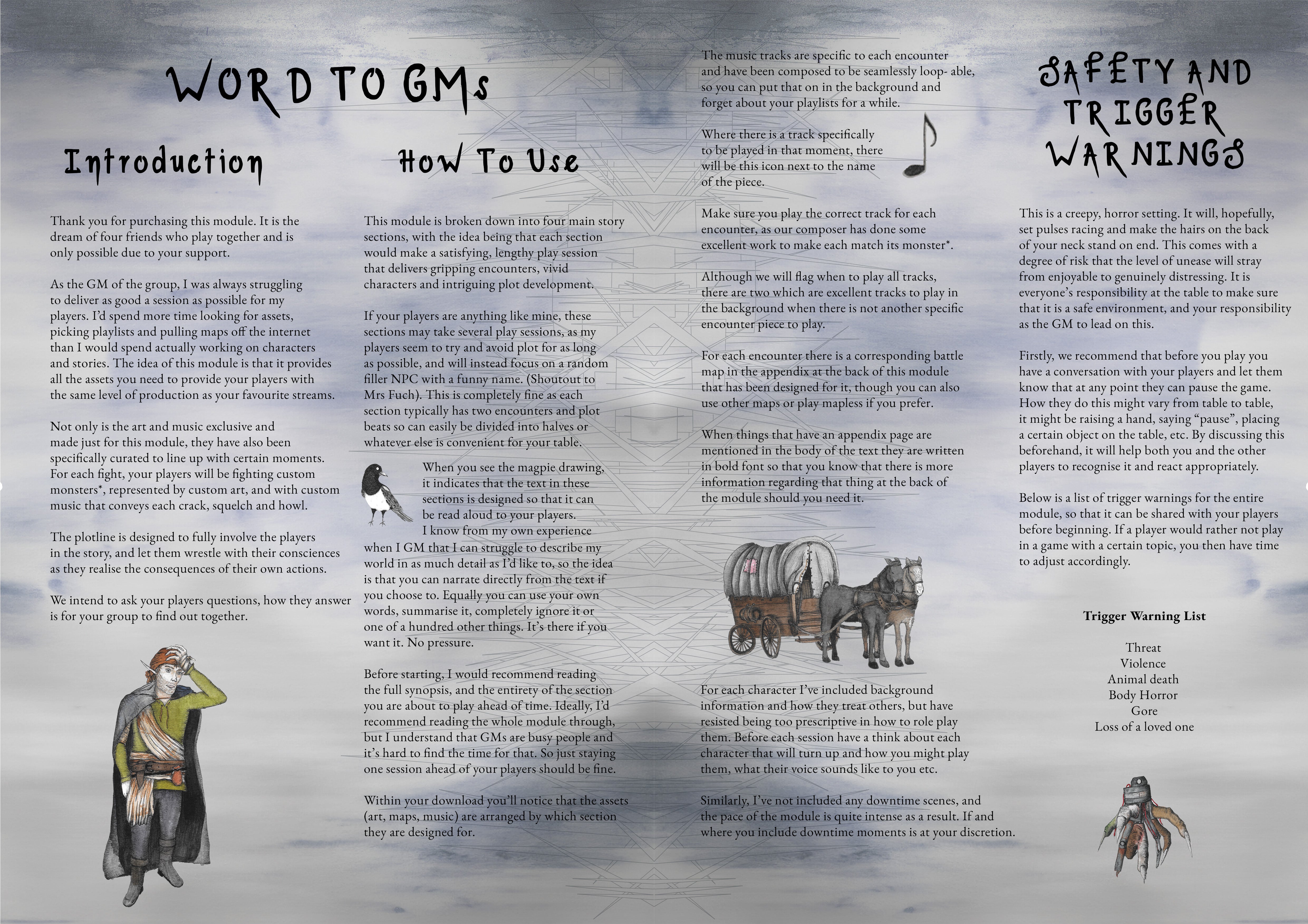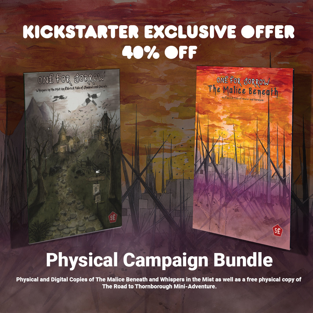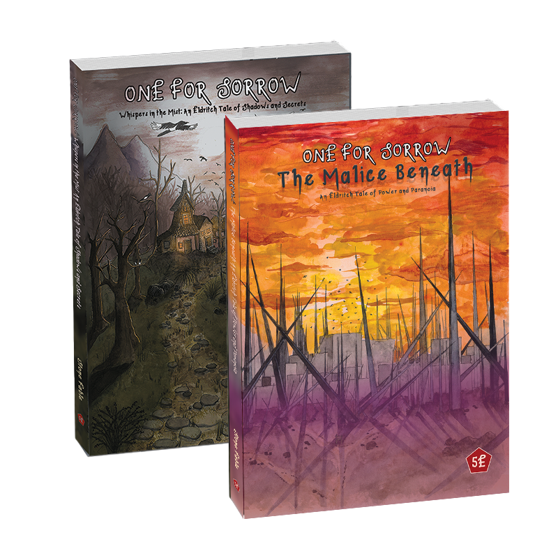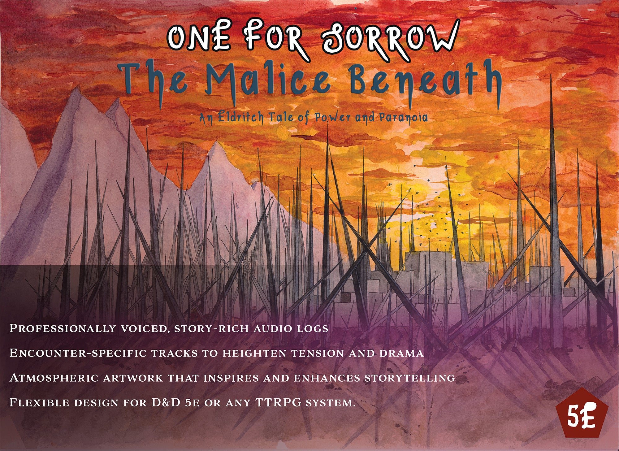 One For Sorrow: The Malice Beneath is an immersive eldritch horror TTRPG campaign designed for D&D 5e but flexible for any system. The sequel to the much loved 2024 release Whispers in the Mist, this 4-8 session adventure takes players fresh from the eerie mists of Thornborough to the shadowy depths of a mysterious city, exploring themes of nuclear architecture, folklore, and corruption. Featuring hand-painted watercolour art, an original soundtrack, and horror game-style audio logs, this module delivers unparalleled atmosphere and storytelling.